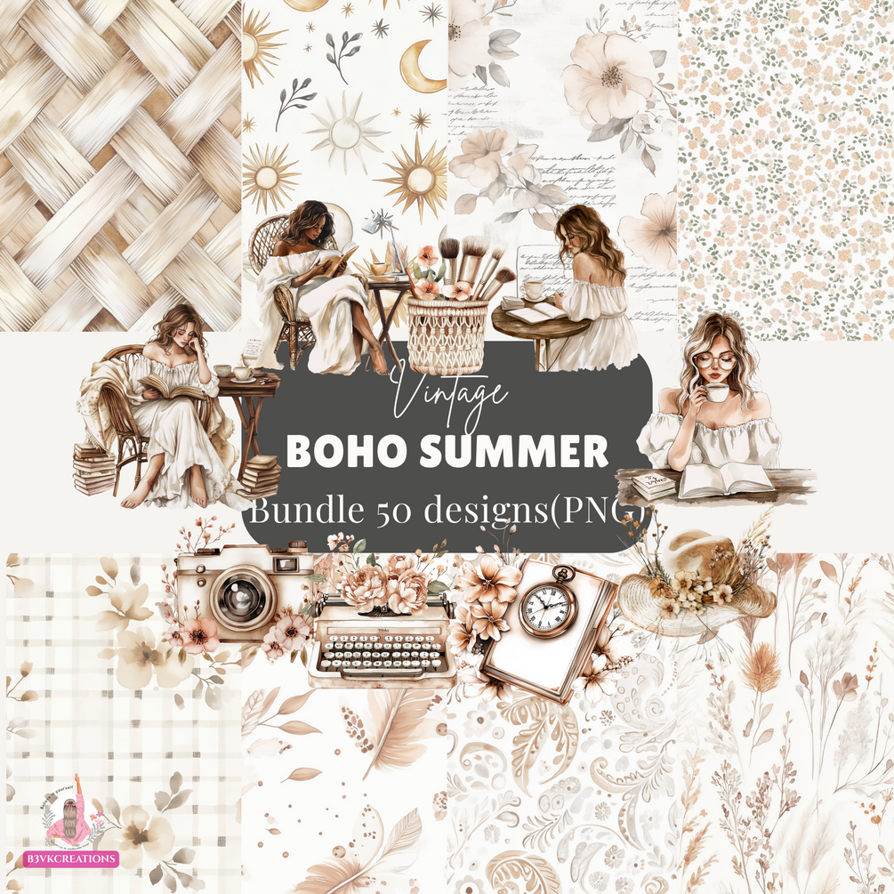 Boho Summer Clipart Bundle | Aesthetic Beach Vibes PNG | Bohemian Sun Rainbow Floral Graphics | Digital Download